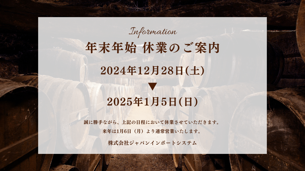 年末年始の営業日程についてinformation 年末年始 休業のお知らせ 誠に勝手ながら、12/28(土)~1/5(日)まで休業させていただきます。 来年は1/6(月)より通常営業いたします。 株式会社ジャパンインポートシステム